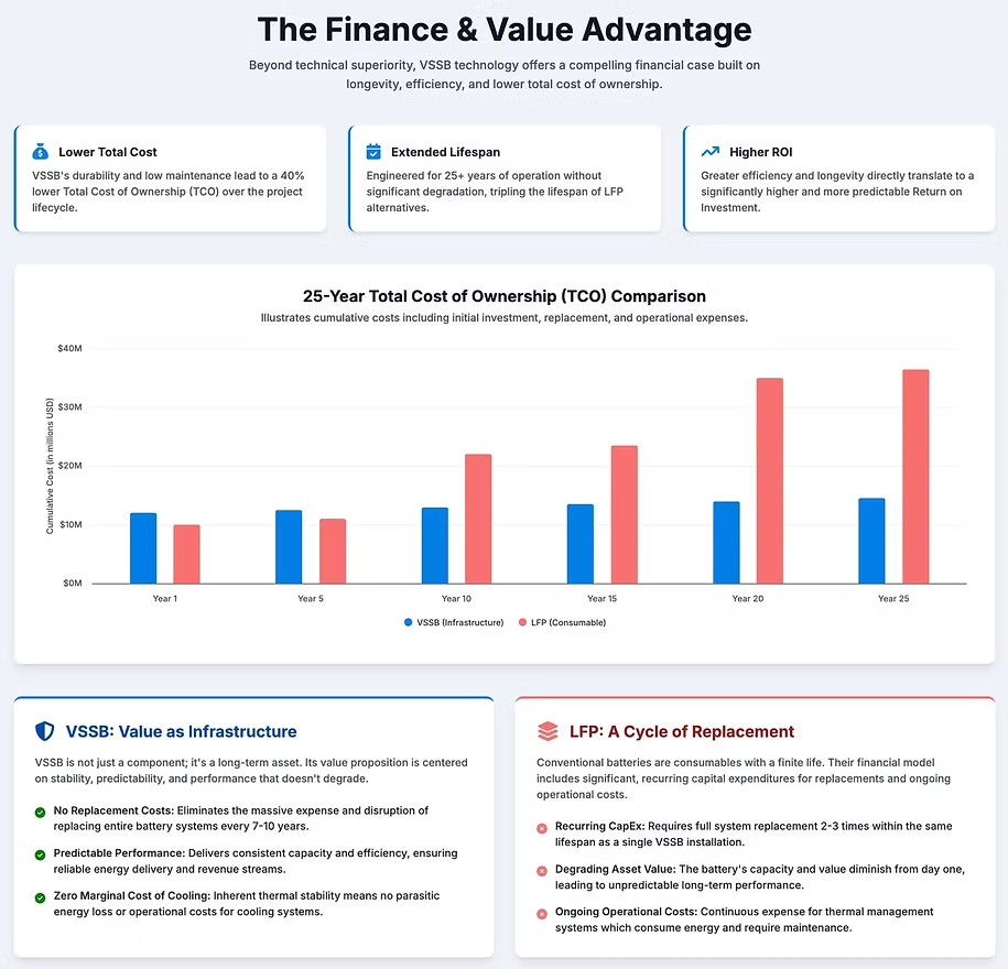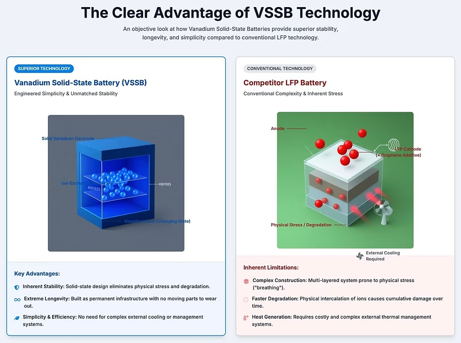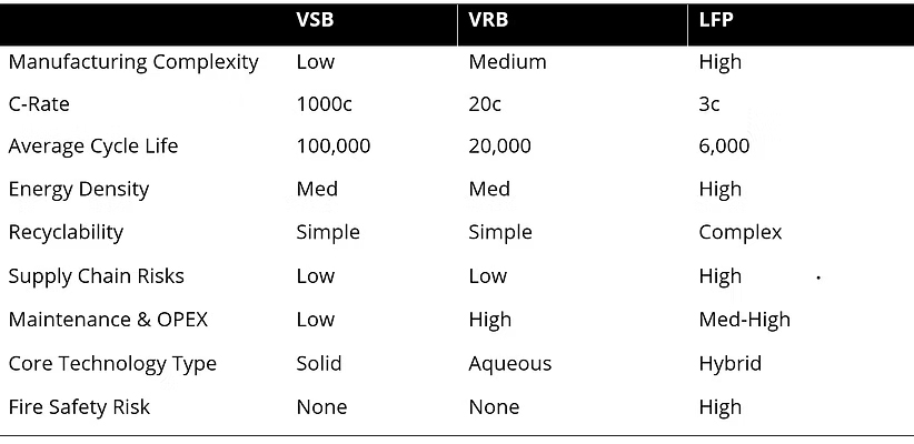 当社は、バナジウム固体電池(VSB)を基盤技術として、主要な蓄電方式との比較分析を行っています。